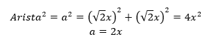 La longitud de la arista (a) de la pirámide se calcula con base en la figura que se anexa, este triángulo se dibuja en la diagonal del cuadrado de la base (ver Figura 4); el cateto del triángulo rectángulo es equivalente al valor de y calculado anteriormente.