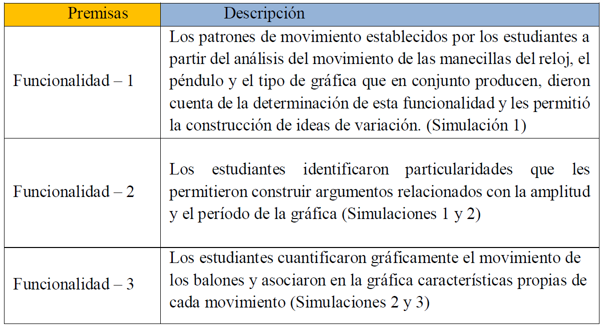 Las descripciones que se presentaron en la tabla dan cuenta de que los participantes de este estudio pasaron por tres momentos asociados al trabajo con cada simulación, desarrollando un proceso de modelación con gráficas. El análisis de gráficas les permitió vincular movimientos en una y dos dimensiones con representaciones visuales conocidas. Aunque los estudiantes tenían experiencias previas con este tipo de gráficas, sus comprensiones carecían de significado de variacional, es decir, para ellos, esas gráficas no eran modelos de fenómenos de variación periódica.