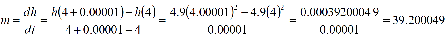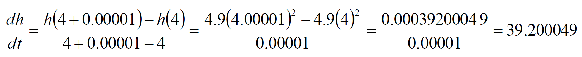 Por tanto, cuando se considera un cambio o variación infinitamente pequeña en la variable independiente [en este caso, la variación o cambio es (4 + dt)- 4 = 0.00001 , es decir, dt = 0.00001 ], se genera, en torno a la estimación de la velocidad instantánea de la caída libre del objeto esférico, el acto de modelación siguiente: