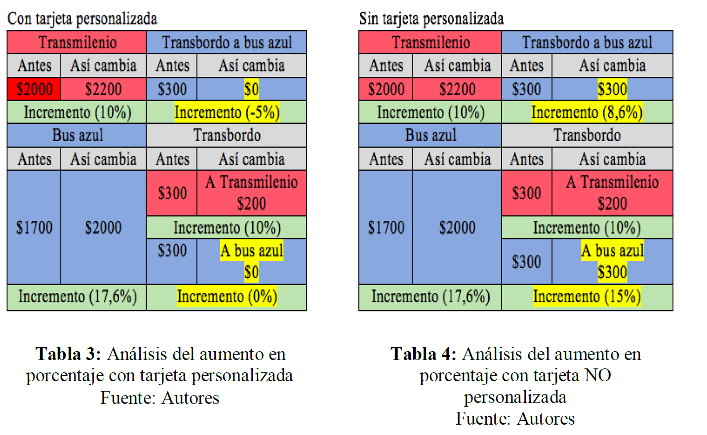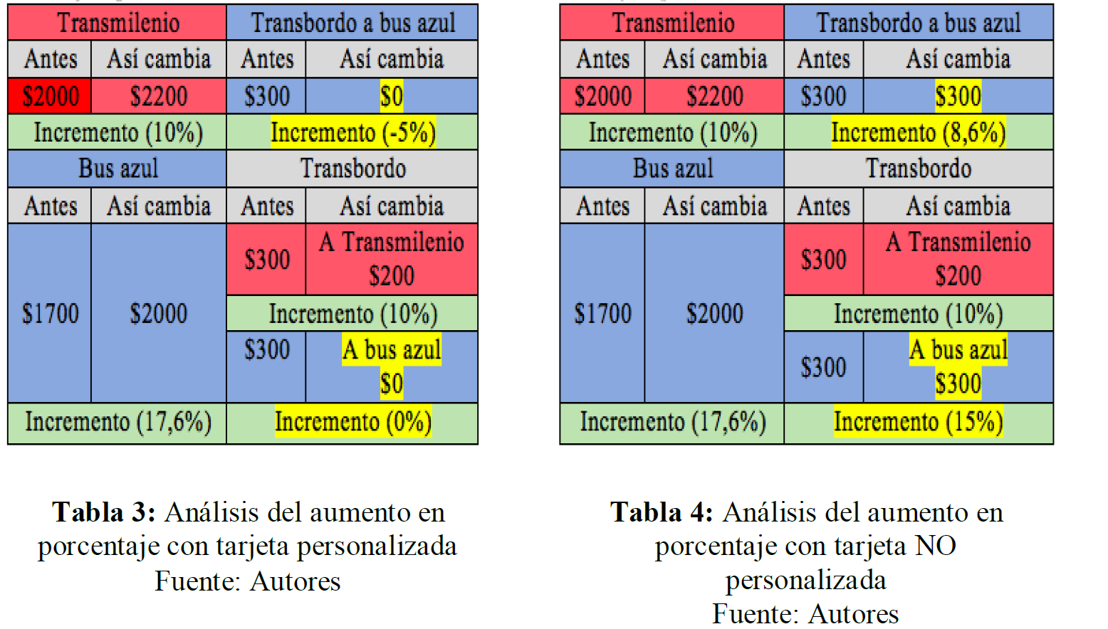 Bajo estos ejemplos de recorridos, los jóvenes tomaron conciencia de que existen variables y casos que no son presentados en la tabla 1, lo que da paso a un análisis más profundo de la situación. Por ejemplo, si el usuario cuenta con tarjeta personalizada, se aplica lo presentado en la tabla 1, pero si no cuenta con ella, los transbordos tienen un costo de $300 más, lo que equivaldría a un 15% adicional11, por lo que es posible plantear una nueva tabla 2, que no es presentada explícitamente por los representantes de la Alcaldía y el SITP. En tal tabla podemos observar que los usuarios de tarjetas no personalizadas tienen un incremento superior, por lo que asuntos de justicia social se colocan de relieve, más adelante volveremos sobre este asunto. Este hecho los conduce a afirmar que existen, en la modificación del modelo, alzas diferenciadas según el tipo de usuario, por lo que los estudiantes proponen las tablas 3 y 4, donde se evidencia que se incrementan las tarifas hasta en un 17,6% para los usuarios de Transmilenio y hasta un 15% para usuarios de solo buses azules, lo cual está muy por encima de los costos que puede asumir un usuario regular.