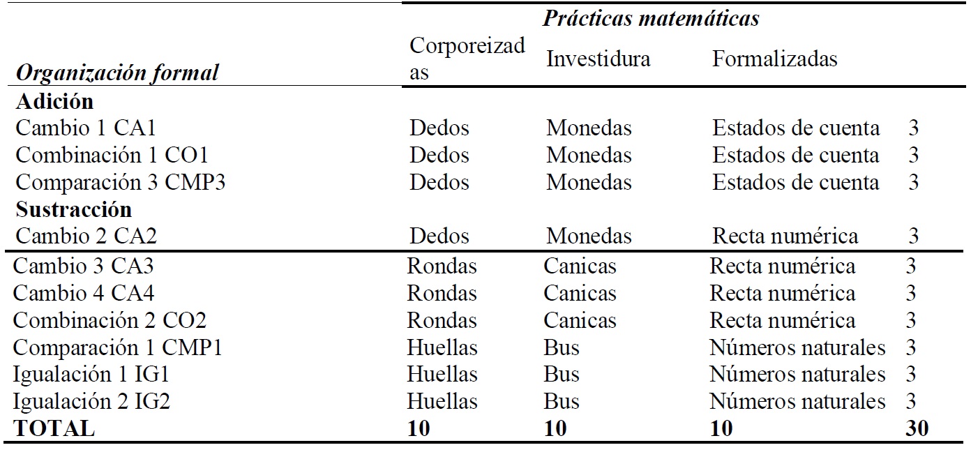 c. Prácticas formalizadas: Tienen lugar en espacios académicos institucionalizados, se caracterizan por la invocación de información transmitida a través de la enseñanza, lo cual incluye criterios conceptuales y reglas que rigen las operaciones (Godino, Font, Wilhelmi y Arrieche, 2009; Lave, 1991). Son las prácticas que se aprenden en el proceso de enculturación matemática formal, las cuales exigen el reconocimiento y manipulación de objetos simbólicos (números y operadores).