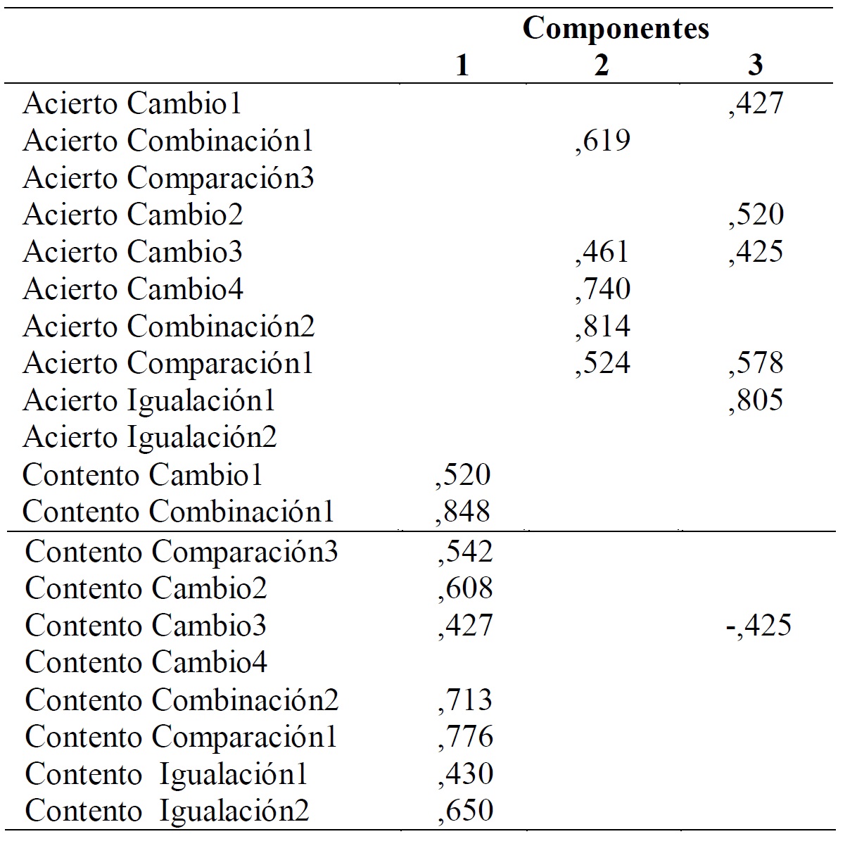 Se seleccionaron los tres factores mayores a 1.35 en valor propio, y su composición muestra que en el primer factor se agrupan las valoraciones de contento, por estructura semántica. El segundo y tercer factor incluyen los aciertos por estructura semántica, donde se agrupan problemas que comparten configuraciones semánticas específicas.