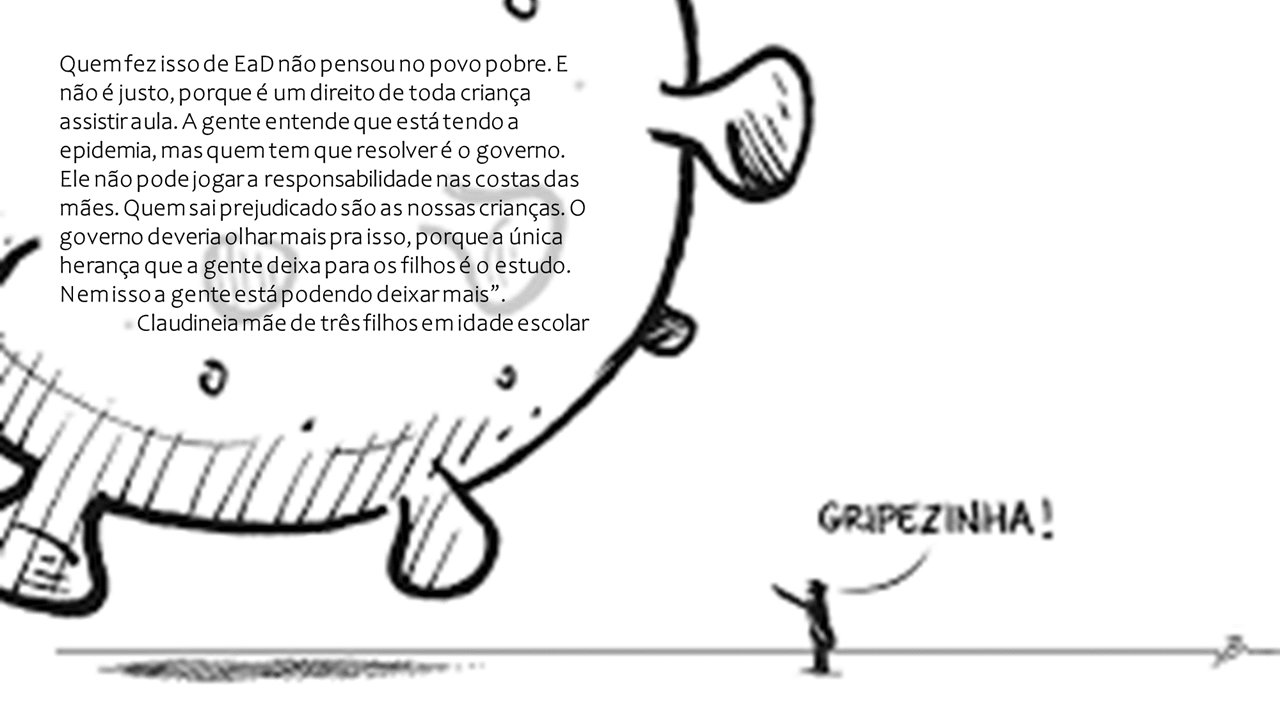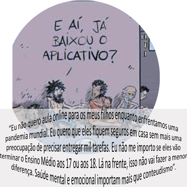 A seguir, apresentaremos falas de crianças, jovens e famílias, assim como imagens relacionadas aos problemas e dilemas da educação nesta pandemia, que colocaram-se em circulação pelas mídias e redes sociais eletrônicas após o início do isolamento social e do fechamento das escolas públicas da Educação Básica, procurando tensionar e pensar de modos outros os desafios e possibilidades da Educação (Matemática) em tempos de uma vida outra provocada pelos efeitos do “Covid-19”.