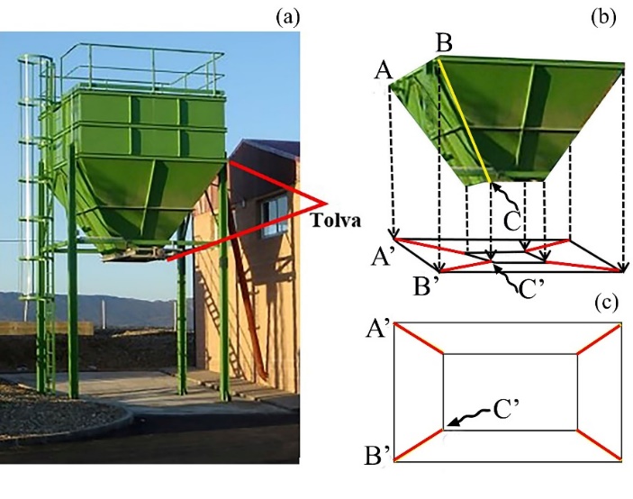 En la estancia realizada en la empresa se observó el proceso de construcción de algunas tolvas, figura 1(a) y (b). La forma geométrica y el uso (que depende de su forma) de la tolva es variada. En particular, se observó el proceso de construcción de la tolva con forma de pirámide truncada, la cual es empleada para almacenar y vaciar por gravedad materiales granulados (maíz, trigo, frijol, entre otros).