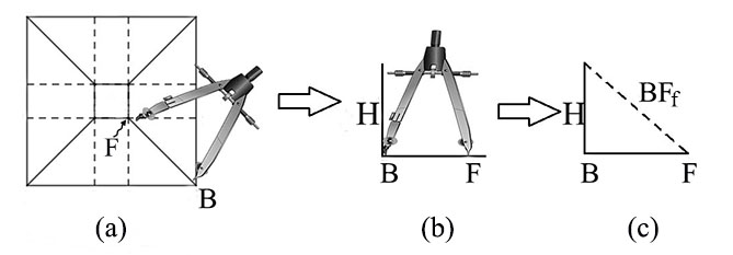 Los estudiantes también argumentaron que el triángulo interno en cada tolva había sufrido modificaciones, los alumnos señalaron que debido a que existe una relación entre los lados de un triángulo rectángulo, el hecho de mantener constante la altura en las tolvas y necesitar cierta inclinación para un vaciado más rápido, la longitud de la base del triángulo también tiene que modificarse, es decir, entre más inclinada la arista, ver F’B en la figura 3(d), más grande la base del triángulo rectángulo, ver FB en la figura 3(d).