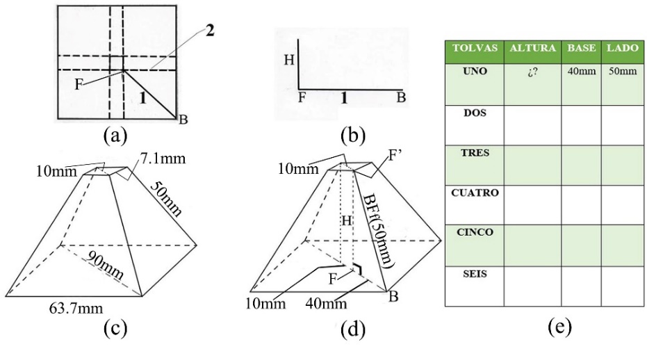 Se discutió sobre las longitudes “reales” y “virtuales” del plano/esquema y se explicó el proceso de construcción de la tolva de manera algorítmica sin señalar de que en el plano de filtrado la H se trataba de la altura de la tolva, figura 3(b), esto fue señalado hasta la tercera etapa. La tolva se construyó aproximadamente en dos horas. También se solicitó a los alumnos que midieran y registraran las longitudes de las aristas de la tolva con objeto de motivar la identificación del triángulo rectángulo interno F’BF, ver la figura 3(d). Cabe destacar que las medidas del plano/esquema y del plano de filtrado fueron tales que las medidas del triángulo interno F’BF se correspondían con la terna pitagórica “3, 4 y 5” en milímetros, es decir, “30mm, 40mm y 50mm”. La longitud de FB=40 mm fue calculada por los alumnos (bajo la guía del profesor) al restar la longitud de la diagonal de la boca, 10 mm en la figura 3(c) y (d), a la longitud de la diagonal de la base medida con la regla, 90 mm en la figura 3(c), y luego al dividir entre dos para obtener los 40mm, figura 3(d).