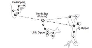 To star navigate, you need to know such things as how to predict weather and how to build emergency shelters; you need to memorize place names and observe subtle environmental clues from seasonal indicators such as snow waves and “paths” created by frozen grass covered by snow. You also need knowledge of traditional methods of measuring angles, accounting for time and distance, stories that reinforce routes, and how wind-bent trees provide direction. Frederick clearly showed us how Kaviaraat (the Fox) contains Agyarrluk (the North Star) which is at the center of his system; the two constellations that rotate around the North Star are Tunturyuk (the Caribou) which refers to the Big Dipper and Oengartarak (the Nose with Two Nostrils) which refers to Cassiopeia providing critical information about time, location, and direction. Figure 2 is a computer enhanced version of how Frederick George and other Yupiaq Elders drew their view of Cassiopeia, the North Star, and the Big Dipper.