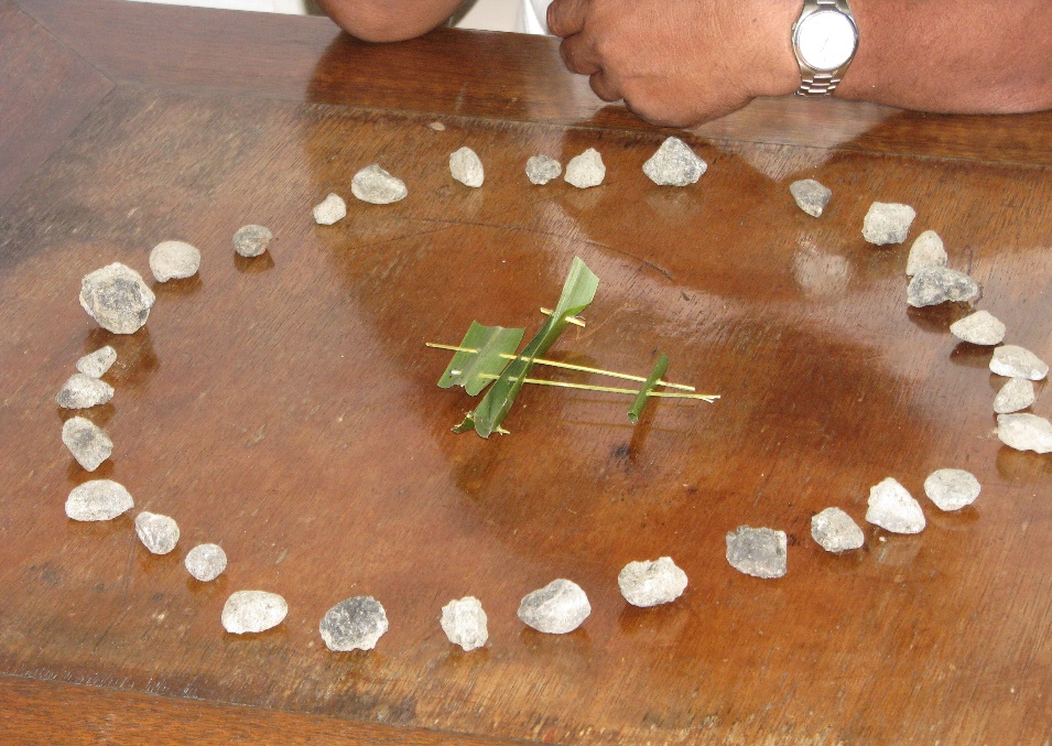 Part of Waa’gey’s program includes being simultaneously culturally traditional, adaptive, and creative under conditions of large-scale environmental changes. The ancient art of navigating in some ways begins with learning the procession of rising and setting stars. In Figure 4 below Ali Haleyalur demonstrated the set of rising/setting stars used in navigating. However, Larry Raigetal explained the star map also functions like a calendar, indicating times of stormy and calm weather. Climate changes has altered these patterns, presenting new challenges to the art and science of navigating.