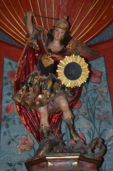 Los Echevarría eran una familia de conveniencia en el medio isleño[163] y no dudaron en colocar el escudo de armas en lo alto de un retablo que estimaban como signo o símbolo votivo, porque una inscripción latina existente junto a la mesa del altar recuerda que sus promotores invocaron la intercesión de San Miguel como «auxilio del pueblo de Dios», al igual que como «protector» de quienes habían conferido prestigio al linaje cuando mediaba el siglo. La misma escritura refiere que los Echevarría y Manrique de Lara «habían pasado bastantes fatigas y desvelos para concluir la santa imagen», al tiempo que previene sobre la fragilidad de su constitución material. De ahí que advirtieran que «es tanta la fineza, primor y delicadeza que no permite sacarlo del nicho sin conocido peligro en algún quebranto», por lo que terminarían prohibiendo que fuera retirada de él[164].