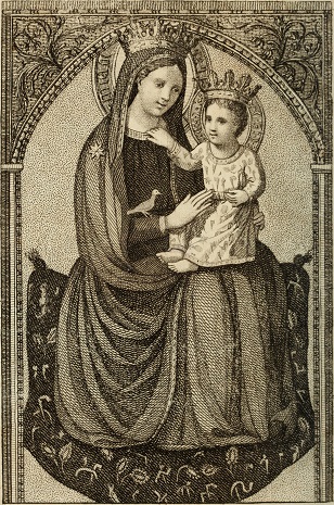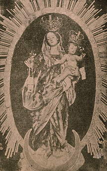 El resultado de su trabajo fue una efigie afín al simulacro pictórico de la Madonna delle Grazie o di Montenero que se atribuye al maestro Jacopo di Miquelle detto Gera (…1341-1395…), muy popular en la Toscana, cuyo santuario en las proximidades de Livorno empezaría a reconstruirse desde 1744 y despertó pronto el interés de viajeros, eruditos y devotos que lo frecuentaron para conocer la historia de su aparición milagrosa a unos pastores del lugar en mayo de 1345[175]. De hecho, no descartamos la posibilidad de que Montenegro fuera partícipe de la difusión que tuvo su culto gracias a publicaciones dieciochescas como la de Giorgio Oberhausen, editada en Lucca durante 1745 e ilustrada con una lámina que, a modo de vera efigie, reproduce el cuadro o icono medieval que Molner recreó en la escultura tinerfeña[176] (Fig. 14). Nuestro comitente no dudó al escoger ese título para presidir el retablo de la ermita, porque, como declaraba al momento de testar, profesó mucha devoción a «esta Virgen (…) aparecida en Liorna»[177]; y aunque no lo explica como tal, en una determinación así se esconde el anhelo de significar piadosamente el apellido que dio sentido a un linaje reivindicado con iniciativas muy diversas en el medio local[178].