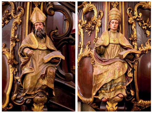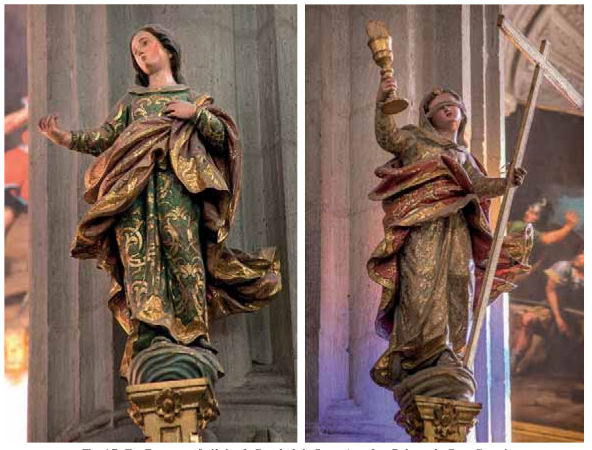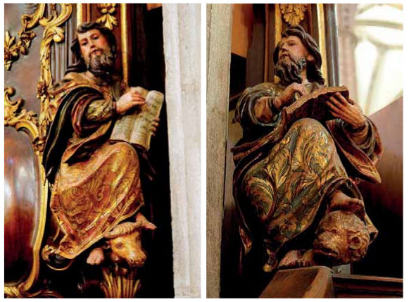 El encargo contempló la ejecución de al menos dos series de esculturas: una dedicada a los evangelistas (Fig. 16) y otra a los padres de la Iglesia (Fig. 18), además de dos tallas de mayor tamaño que rematan en lo alto sendos tornavoces y representan de modo alegórico a la Fe y a la Esperanza (Fig. 17). El coste total ascendió a 5160 reales, englobando esa suma la hechura de las imágenes de cada serie (600, 800 y 800 reales respectivamente), su policromía y estofado (2480 reales), y lo derivado del embalaje y los fletes en «cajones medianos» (480 reales)[199]. La diferencia de precio entre ellas y su propio acabado denotan que no fueron realizadas por una misma mano, aunque en ambas series quedan patentes planteamientos iconográficos al uso y unos condicionantes que podrían extrapolarse a muchos talleres de la ciudad durante esa época. Así, por ejemplo, las obras de los tornavoces resultan deudoras del estilo definido antes por un maestro de fama imperecedera como Duque Cornejo (Fig. 17), mientras que los padres de la Iglesia, sin duda las de mayor calidad, debió de ejecutarlos un artífice que reprodujo formas popularizadas por Cayetano de Acosta en creaciones contemporáneas o de fecha anterior. De hecho, coincidimos con Herrera García en la hipótesis de que este conjunto en concreto y no la serie de los evangelistas pudo esculpirlo un maestro que colaboró o trabajó cerca de Acosta (Fig. 18). La unidad de todas las piezas se consigue con su revestimiento polícromo y unos estofes que describen motivos muy vistosos, aunque las carnaciones, los galones cincelados en parte y otros detalles recreados a punta de pincel confieren un atractivo mayor a cada conjunto y eluden la simpleza de una talla suelta o de mayor indefinición, no exenta de armonía por la interpretación gestual de los personajes efigiados (Fig. 16).