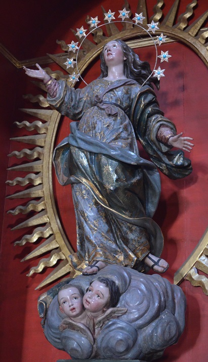 El recuerdo de las creaciones de Duque Cornejo e Hita y Castillo resulta extensible a otras imágenes llegadas al archipiélago en ese tiempo, pues así lo constata la Virgen de la Asunción de San Sebastián de La Gomera (Fig. 19). A ella se han referido varios investigadores por responder a una donación del clérigo Diego José Fernández Acevedo, aunque dicho sacerdote, uno de los más influyentes que vivieron en la isla, no llegaría a verla entronizada antes de morir en 1789 y comisionó para ese fin a su hermano Juan de la Mata Fernández. Tras varios años de espera, fue bendecida con motivo de las fiestas organizadas por mayordomos y vecinos en agosto de 1790[200], de modo que esa cronología y el ornato pictórico invalidan la atribución tradicional a Cornejo o a algún maestro de su obrador que venía defendiéndose[201]. La talla es una muestra excelente de las dotes que pudo adquirir Blas Molner, a quien, como ya apuntamos, se ha adscrito convincentemente por último[202]. Molner es autor de una representación afín y del mismo tema conservada en la localidad navarra de Echalar (1781)[203], pero, a diferencia de ella, la obra gomera reproduce soluciones vigentes en la imaginería sevillana desde principios de siglo y ofrece repertorios de gusto rococó con una elegancia inusual, hasta el punto de que se convierte en muestrario de los motivos y procedimientos técnicos que manejaron los pintores y estofadores más cualificados cuando terminaba el siglo XVIII. Tal circunstancia y la corrección del acabado merecen un estudio detenido, porque, a buen seguro, su análisis permitirá la catalogación de esculturas coetáneas en Sevilla y localidades próximas. Con todo, no nos resistimos a señalar que después de su entronización en 1790 la Virgen incitó reformas en el presbiterio donde quedaría emplazada, ya que ese hecho fue clave para la renovación del patrimonio heredado y de los cultos que empezaba a presidir[204].