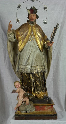 Al margen de la identidad no confirmada de los donantes, tanto esta imagen como la de San Francisco de Borja podrían tratarse de obras sevillanas por la singularidad de sus rasgos fisonómicos, los modelos compositivos ya aludidos y, en lo concerniente a la efigie de San Juan Nepomuceno, el adorno de los textiles que reproducen rasgos acordes al gusto tardobarroco (Fig. 22). Abundan en ello detalles de su policromía como el marmolado de la base, la recreación del armiño en la esclavina y la muceta, el simulacro de brillos con efectos de telas lisas y los estofes de la sotana inferior sobre fondo negro, que simplifican repertorios previos en búsqueda de una mayor naturalidad y armonía visual. A falta de pistas documentales, esas cualidades nos inducen a datar ambas piezas durante la década de 1770, aunque sus carnaciones ―y particularmente las del angelito de la peana, habitual complemento iconográfico― pudieron alterarse a raíz de una intervención acometida por Nicolás Perdigón (1853-1939) en 1928[230].