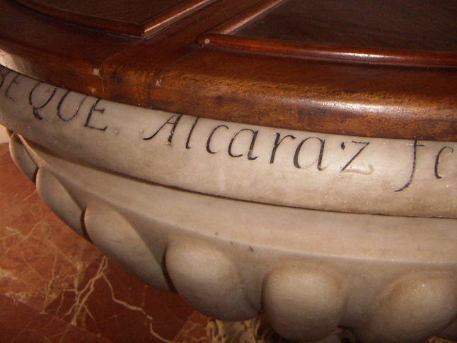 A pesar de las transformaciones operadas en el medio isleño, los comitentes no se resistieron a perpetuar su recuerdo o legado por medio de inscripciones, escrituras notariales y mandas muy diversas, incumplidas la mayoría de las veces. Además, en ocasiones el dinero disponible para los encargos era de procedencia americana y exigía sacarle una rentabilidad mayor con el propósito de aumentar su montante gracias al comercio ultramarino. Hay varios ejemplos de esta dinámica, pero resulta clarificador que Felipe Massieu pagara algunas esculturas de Hita con beneficios que reportaban productos llegados del Nuevo Mundo[51] o que la pila bautismal del templo de la Concepción de La Laguna, labrada por Salvador Alcaraz en 1759, fuese costeada con fondos que el indiano Miguel Díaz Pérez había dejado a principios de siglo para ese propósito. La inversión de su limosna inicial en acciones que tutelaba José Retortillo favoreció que el dinero generase los beneficios necesarios para cubrir los pagos de la pieza marmórea a mediados de la centuria. Como recuerdo de ello, la pila ostenta una inscripción al borde de la taza que alude al donante, al mayordomo Pedro José Morbeque que hizo posible el encargo y al artista que le dio acabado entre Cádiz y Málaga[52] (Fig. 4).