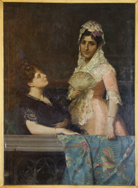 En un ámbito del que se muestran, por medio de un uso inteligente de la luz, solo algunos elementos decorativos como la balaustrada con decoración de tracería gótica, se disponen dos damas: la de la izquierda, de identidad desconocida, sentada; y la de la derecha, la citada Parladé, de pie. Esta disposición permite sin dificultad reconocer quién es la auténtica retratada, algo a lo que contribuye igualmente que la aristócrata mire al espectador. Ataviada con un vestido de color rosa[25], cubre su cabeza con una mantilla española de encaje y recoge su pelo graciosamente con flores moradas. El oscuro flequillo le cae desordenado por la frente, algo que refuerza la impronta juvenil de la retratada, de rostro redondeado y bien definido con cejas marcadas, nariz prominente y labios carnosos que ensayan un intento de sonrisa. La mirada parece perdida en otro lugar y la disposición del cuerpo –un brazo con pulsera que pende con laxitud, otro que lleva un abanico con vitola pintada con agradables motivos al pecho– demuestra una educación exquisita y unos modales totalmente adecuados a las circunstancias de la época. Su compañera –que sedente se apoya en un respaldar verde, aparece ataviada con un vestido negro con encajes, que contrasta claramente con su empalidecida piel, y lleva el pelo recogido distinguidamente con una cinta– la contempla fijamente, pero sin dejar traducir las emociones de su semblante. Sus dos extremidades superiores están adornadas por pulseras y porta discretos pendientes en sus orejas. La composición se completa con la colgadura de un mantón celeste con motivos florales de distintos colores sobre parte de esta balaustrada, cuyos pliegues se exponen convincentes por su verosimilitud. Las figuras son tan formidables que ocupan casi toda la composición, con lo que se consigue formular así un retrato para presidir uno de los lugares más destacados del domicilio.