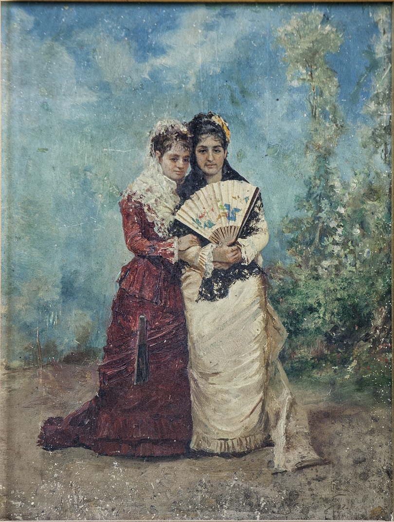 La composición muestra dos damas en un espacio ajardinado. Se sitúan sobre una zona de tierra, pero junto a ellas se disponen algunas plantas y arbustos. Miran al espectador y posan juntas. La de la derecha es la misma protagonista del cuadro anterior: Isabel Parladé y Heredia, que aparece ahora ataviada con un vestido de color marfil que le cubre hasta los pies. Tocada con mantilla negra, el cabello, del mismo color, aparece recogido y adornado con flores anaranjadas. En un gesto lleno de serenidad entrelaza sus manos[26] y sostiene, mostrándolo, un abanico cuya vitela está pintada con esbozos de vivos colores[27]. A su derecha, una amiga, aun no identificada, se abraza a ella, apoyando una mano delicada, con un anillo, sobre su brazo. Luce un bello vestido burdeos, cuyos pliegues brillan, y de factura algo más complejo que el de Parladé: puñetas abiertas que dejan entrever el blanco encaje, un volante plisado en el talle, dos volantes en el vuelo y cola. Está tocada con mantilla blanca y tiene colocado un abanico negro sobre uno de los pliegues de la falda.