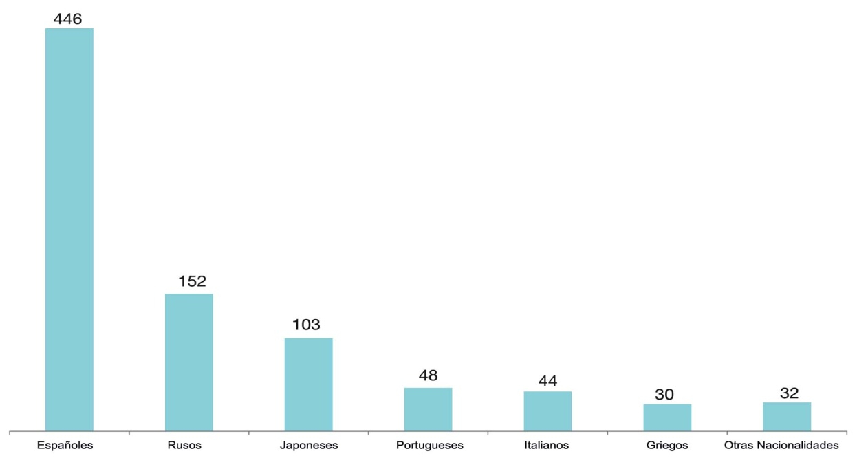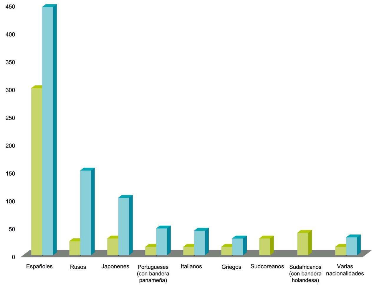 Los barcos pesqueros que operaban en estas costas fueron en aumento hasta 1975. Como vemos en el gráfico 1, que presenta el número aproximado de buques pesqueros que operaban en las distintas zonas del AOE en 1968, al margen de la flota española, había un gran número de barcos rusos y japoneses, a los que seguían los portugueses, los italianos, los griegos y los de otras nacionalidades. En este sentido, el desarrollo técnico, las instalaciones y la envergadura de los barcos rusos y japoneses, era mucho mayor que el de los españoles.