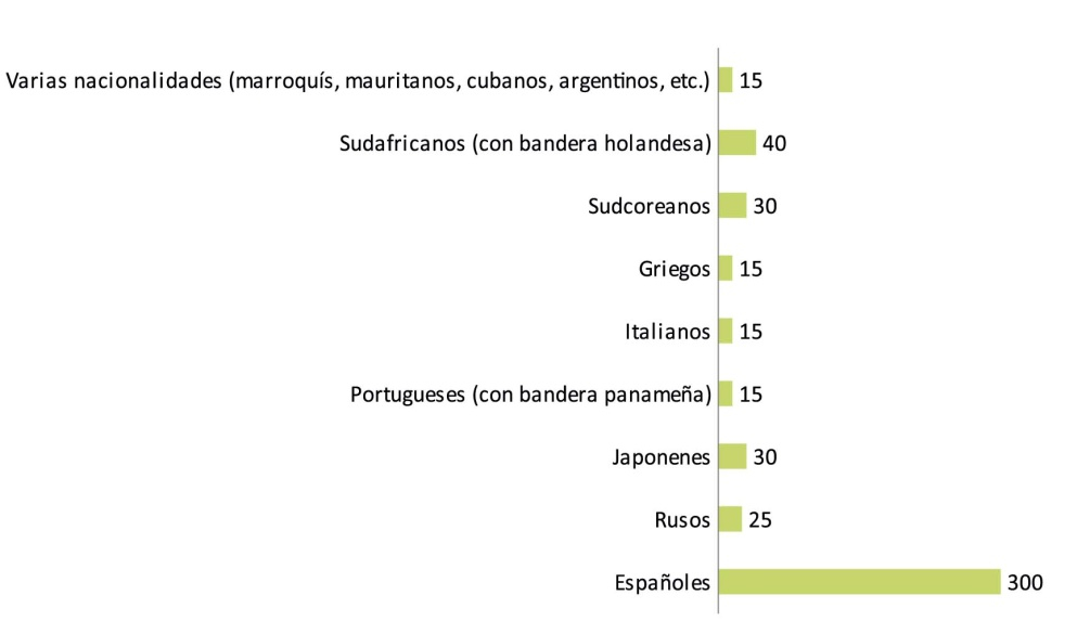 La evolución de las pesquerías canario-africanas puede verse a través de la comparación entre los datos que ofrecen un informe sobre sus características de 1973 y el anteriormente visto de 1969. En el informe de 1973 se destaca el descenso de las capturas[50], indicando como posible causa, una vez más, el inicio del agotamiento del banco. Por otro lado, se llama la atención sobre la disminución del número de pesqueros pues, en el caso de los buques extranjeros, estos contaban ya con «máquinas de arrastre más potentes y operaban en general más lejos de la costa, desapareciendo también varios buques factorías, entre ellos, los japoneses, que se estaban trasladando al Atlántico Sur (zona del este de cabo de Hornos)», donde, al parecer, se habían descubierto ricos bancos de pesca. En cuanto a los caladeros, estos seguían siendo los mismos, aunque se trabajaba también «frente a las costas de Mauritania en distancia de 60 a 80 millas de la costa, aproximadamente al suroeste de Cabo Blanco» y también al norte de El Aaiún entrando en las aguas marroquíes de Tantan y Cabo Juby. Por último, una estimación de la flota pesquera es la que aparece en el gráfico 2, a partir de la que se considera que los mejores barcos, por su potencia y su equipamiento, eran los rusos, los japoneses, los italianos y los sudafricanos, pues los portugueses eran viejos y «los sudcoreanos pequeños (300 Tns.)», aunque todos operaban más lejos de la costa. Con respecto a los españoles, esta era variable y, pese a disponer de algunos arrastreros modernos que podían alejarse más, era una flota compuesta por barcos viejos de madera «con pésimas condiciones de habitabilidad» y que se arrendaban a compañías pesqueras[51].