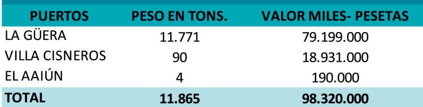 Por otro lado, en la colonia se desembarcaba pescado fresco que iba a parar a las factorías de transformación del pescado en subproductos establecidas allí. Entre las empresas radicadas en el territorio estaban, por ejemplo, INSAMARTA y OMAR, ambas radicadas en La Güera y con una capacidad de producción anual de 9 mil Tm[56].