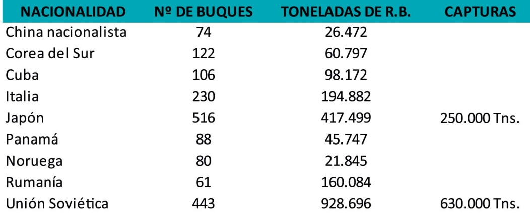 Por último, en las aguas jurisdiccionales españolas también estaba pescando entonces una flota de las islas Bermudas compuesta por 40 buques, con un total de 13 mil TRB, con su buque factoría L´interpeche, cuyas capturas fueron en 1973 de 182 mil Tm y un importe de 728 millones de ptas., y en 1974, de 160 mil Tm. y 480 millones de ptas.[57] Fuera de las 12 millas, pero también en el banco pesquero canario-sahariano, pescaban flotas de las siguientes nacionalidades: