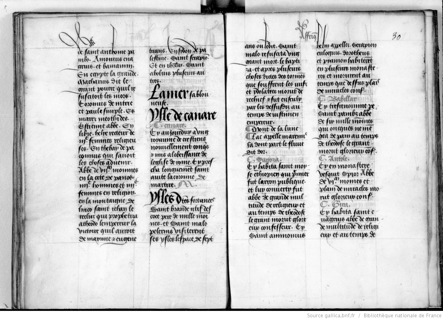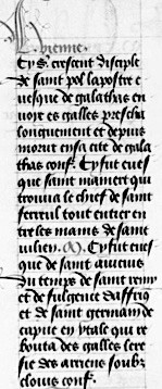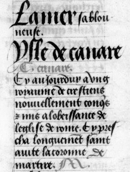 Siendo así que es cierto que muchos caballeros, al escuchar contar las grandes aventuras, las hazañas y las hermosas acciones de los que, en tiempos pasados, han emprendido hacer viajes y conquistas sobre los infieles, con la esperanza de cambiarlos y convertirlos a la fe cristiana, han cobrado valor, atrevimiento y voluntad de parecerse a ellos por sus buenas obras; y con el fin de evitar todos los vicios y ser virtuosos y que al terminar sus días puedan ganar vida eterna, Gadifer de La Salle y Jean de Béthencourt, caballeros naturales del reino de Francia, han emprendido este viaje para honra de Dios y para mantenimiento y aumento de nuestra santa fe, a las partes del Mediodía, a ciertas islas que están hacia aquel lado, que se llaman las islas de Canaria habitadas por gentes infieles de diversas leyes y de diferentes lenguajes, de las cuales la Gran Canaria es una de las mejores y de las más importantes, con la intención de convertirlas y de atraerlas a nuestra fe; y por esto este libro se llama el Canario[54].