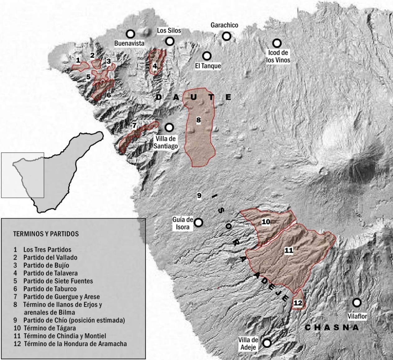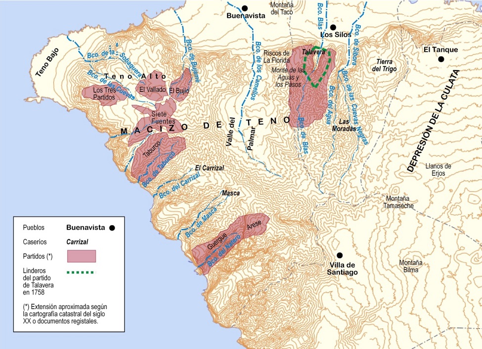 En un relato muy difundido del Diario del vizconde de Buenpaso se contiene una descripción del año 1810 donde se indicaba que en Teno Alto existían ocho partidos destinados fundamentalmente a pastos de ganado y en menor medida al cultivo de trigo y cebada[27]. En la mayoría de los casos estos partidos estaban agregados a los mayorazgos de las principales familias aristocráticas de la comarca de Daute, como eran el partido de Guergue y Arese, perteneciente al marqués de La Florida, el partido de Siete Fuentes, del conde de Siete Fuentes, el partido de Bujío que en el siglo XVIII había pasado a manos de los vizcondes de Buenpaso, el partido de El Vallado, perteneciente al mayorazgo Interián, que a fines del XVIII poseían los Benítez de Lugo Arias Saaveedra y Ponte, señores de Fuerteventura, el conocido como Los Partidos (Los Tres Partidos) perteneciente al mayorazgo de la familia González de Buenavista, y el partido de Taburco.