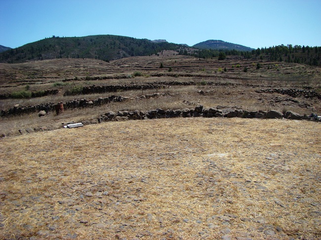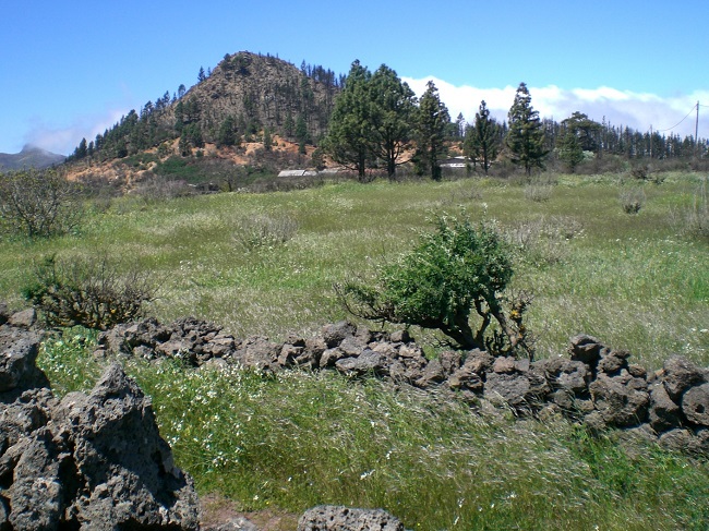 Las condiciones favorables de la zona para el cultivo de cereales en régimen de secano y la existencia de un manantial de cierta consideración en este espacio desforestado (la fuente de Ruigómez) facilitaron la colonización de las tierras de Erjos desde comienzos del siglo XVI. Ahora bien, durante el último tercio de la centuria se inició una nueva oleada de roturaciones, proceso que acabó manifestándose en talas y rozas de los montes que aún poblaban las tierras altas del término[14]. Como hemos señalado en otros trabajos, estas apropiaciones de términos concejiles que se desencadenaron a partir de la década de 1560 tuvieron mucho que ver con la puesta en circulación de datas fraudulentas por parte de Francisco de la Coba, quien había ocupado más de 12.000 fanegadas de terreno a lo largo de la isla, reclamando para sí viejas datas ya cumplidas, pero con linderos confusos que permitían una interpretación más o menos libre de sus límites[15]. En 1571 el Cabildo entabló un proceso contra algunos vecinos del caserío de El Tanque por talas, quemas y rozas de terrenos de monte situados por encima de la fuente de Ruigómez, donde habían cortado árboles propios del monteverde como laureles, palos blancos, sanguinos, brezos y aceviños[16]. Tras seguir el juicio de restitución conforme a la Ley de Toledo, el Cabildo tomó posesión de estas tierras en 1586 como pertenecientes a los montes de la Isla, de modo que a partir de entonces quedó delimitado oficialmente el perímetro de los montes públicos en aquella zona[17]. Aunque los primeros amojonamientos se realizaron muchos años después, el área montuosa incluía dentro de su perímetro los caseríos actuales de La Montañeta y San José de Los Llanos hasta llegar al paraje conocido como “el Pino del Aire”, ya en la jurisdicción del Valle de Santiago, donde se consideraba que comenzaban las bandas del sur[18]. Como sucedía en otras zonas de la isla, el monte concejil en la zona de Erjos fue delimitado por una pared de piedra, que lo dividía de las tierras de particulares e impedía que los ganados que pastaban allí bajasen al término cultivado.