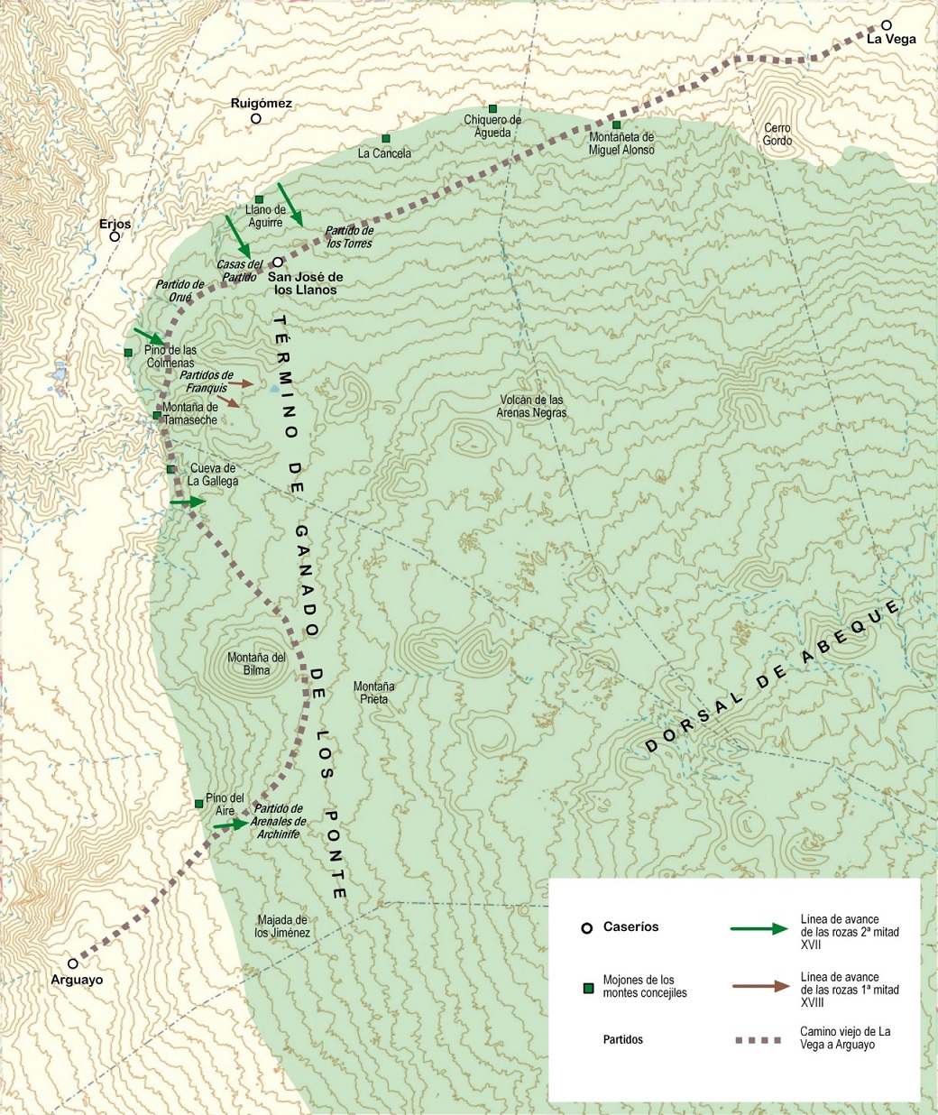 Según se desprende de los autos que siguió el Cabildo en 1681 sobre rozas en los llanos de Erjos, montaña de Bilma y Valle Santiago, los Ponte mantuvieron bajo su control durante mucho tiempo un extenso término de ganado que ocupaba los montes situados entre los núcleos actuales de San José de Los Llanos y Arguayo, si bien hacia fines del siglo XVII otros grandes propietarios comenzaron a disputarle el dominio de la zona. Un testigo de aquel proceso judicial indicaba al respecto que: