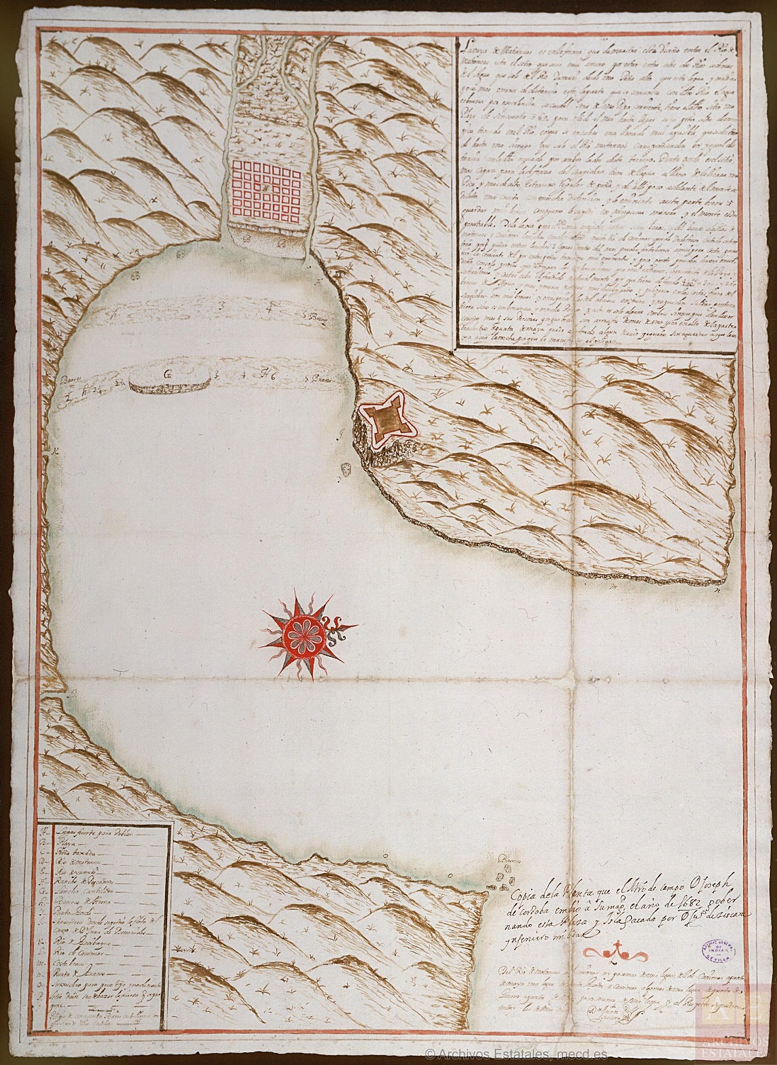 Resulta curioso observar cómo este informe enviado a Madrid por Manzaneda para denunciar el error del proyecto de Fernández de Córdoba es firmado por Juan de Císcara, mismo autor del fallido. El motivo lo encontramos en la declaración en los autos del propio ingeniero, quien justifica que el plano anterior fue realizado según informes de pescadores de hacía más de 40 años y, por tanto, imprecisos y con datos erróneos[18]. Es ahora cuando se envía a Madrid la copia del plano de 1681 a la que aludimos anteriormente para justificar el cambio de proyecto[19]. La misiva de Manzaneda se acompañaba de otro plano que redundaba en el error de 1681, aunque sin ser copia exacta de aquel, indicándose en él que la planta herrada es esta (Figura 4)[20].