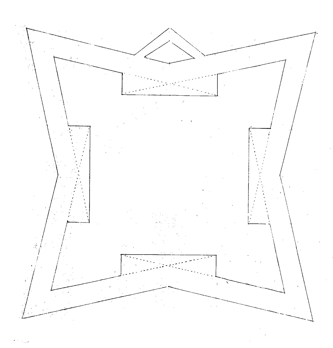 El estudio de la navegabilidad de las aguas no resulta baladí, en tanto que determinaría el mismo plan de defensa por el que se concebía la misma fundación. En atención a ello, y considerando la imposibilidad de que buques de guerra se acercaran al sector fundacional de la ciudad, Fernández de Córdoba establece como ubicación más adecuada para la fortaleza la llamada Punta Gorda, un saliente de tierra en la zona intermedia del litoral norte de la bahía. Es aquí donde aparece trazado en el mapa un tetrágono de cuatro baluartes que defendía la boca y fondeadero de la bahía. El plano venía acompañado de otros dos dibujos muy sencillos de la fortaleza: el primero mostraba la figura del castillo de planta cuadrada con sus cuatro baluartes, rodeado de un foso y protegido de cara al mar con un revellín (Figura 2)[11]; el segundo diseño, de menor envergadura, contemplaba la supresión de los baluartes de la campaña sustituyéndolos por las dos caras de un baluarte en el centro del lienzo, mientras que el frente de mar permanecería con la misma configuración del modelo anterior (Figura 3)[12]. Según copia del presupuesto enviada al rey, la obra podría ser levantada por 30.000 pesos, a razón de cinco pesos por vara cúbica construida[13].