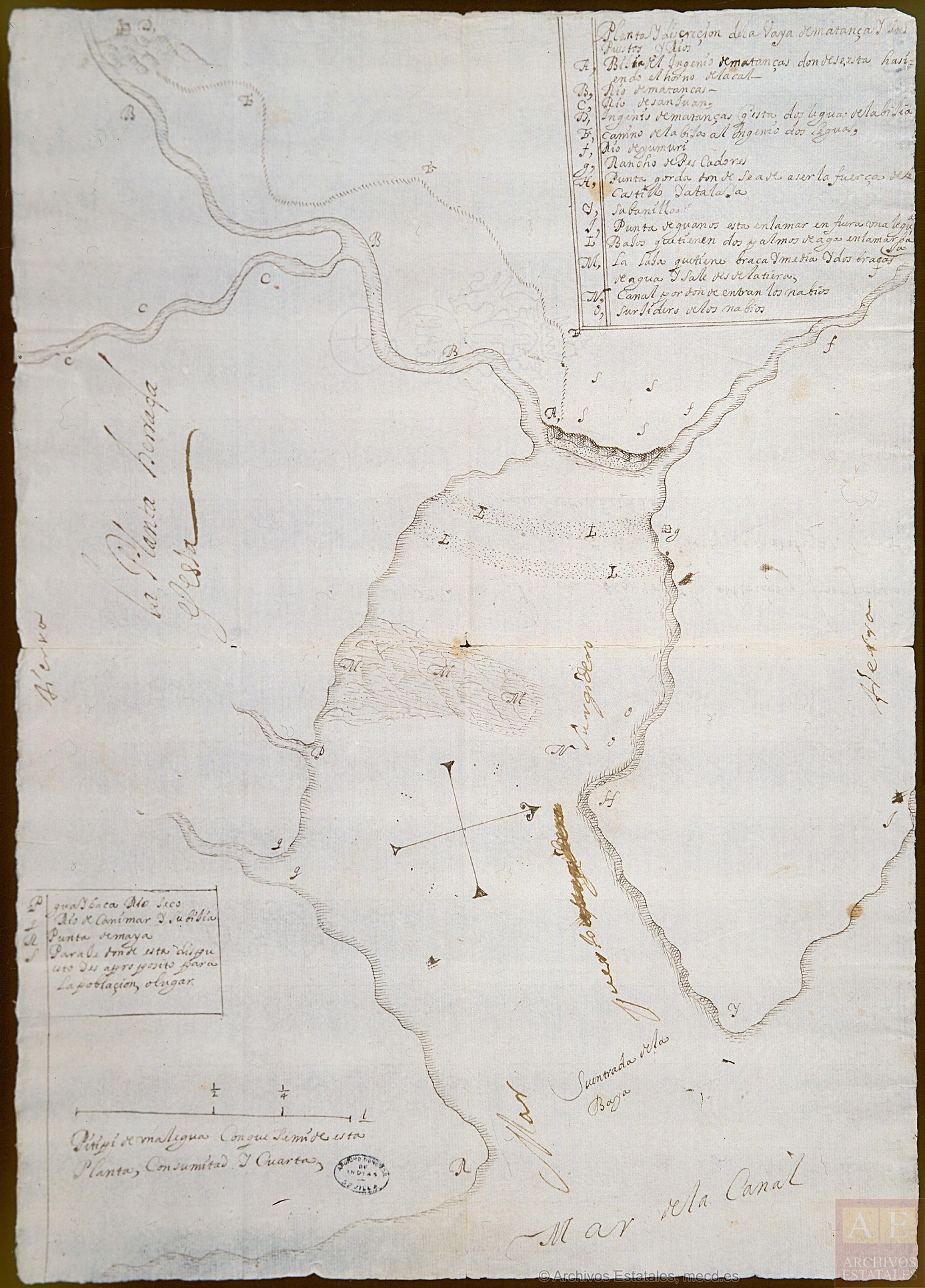 Habrá que esperar al gobierno del capitán general José Fernández de Córdoba para que se sentaran las bases administrativas para la defensa del enclave y la fundación de la ciudad. Fernández de Córdoba se dirigirá por primera vez al rey en 1679 informando de las hostilidades sufridas por Juan Pérez Barroto, regente de un ingenio que suponía hasta entonces la única vigía de la bahía[5]. Como consecuencia, el 12 de septiembre de 1681 el gobernador envía un proyecto, formado por el ingeniero militar Juan de Císcara, de un fuerte guarnecido por 80 hombres que protegería la bahía y la nueva población, a fundar con 30 familias venidas de las Canarias[6]. El proyecto se complementaba con un plano, conocido hoy por una copia conservada entre los autos posteriores emprendidos por Severino de Manzaneda de los que nos ocuparemos más adelante (Figura 1)[7]. En 1924, el investigador cubano Carlos Trelles publicó una copia del mismo plano –quizá el original de 1681– conservado entonces en una colección particular bonaerense[8]. En algunos estudios se consideró, sin embargo, por su alto grado de detalle, como un plano posterior de tiempos de Severino de Manzaneda trazado por el ingeniero Juan de Herrera y Sotomayor[9], si bien la copia conservada en Sevilla descarta tal conclusión. El plano muestra toda la bahía desde su entrada por las puntas de Maya y de Sabanilla, en cuyo fondo aparecen esquemáticamente los ríos Matanzas –llamado más tarde San Juan– y Yumurí. Entre ambos cursos, Císcara proyecta la ciudad, idea que prevalecerá en el tiempo, si bien se evidencian ciertas incorrecciones en las proporciones del recinto delimitado por los ríos al insertar un damero con plaza central que, como veremos, resultaría inviable[10]. El plano y su explicación muestran claramente una de las particularidades de la bahía que mayores problemas causará a los matanceros en el futuro: la presencia de una laja en el centro de la ensenada y de una amplia barra de arena en las proximidades de la desembocadura de los ríos principales, donde, según el proyecto, no podrían entrar apenas cinco barcos ni navegar sin dificultad lanchas en las inmediaciones de la costa.
