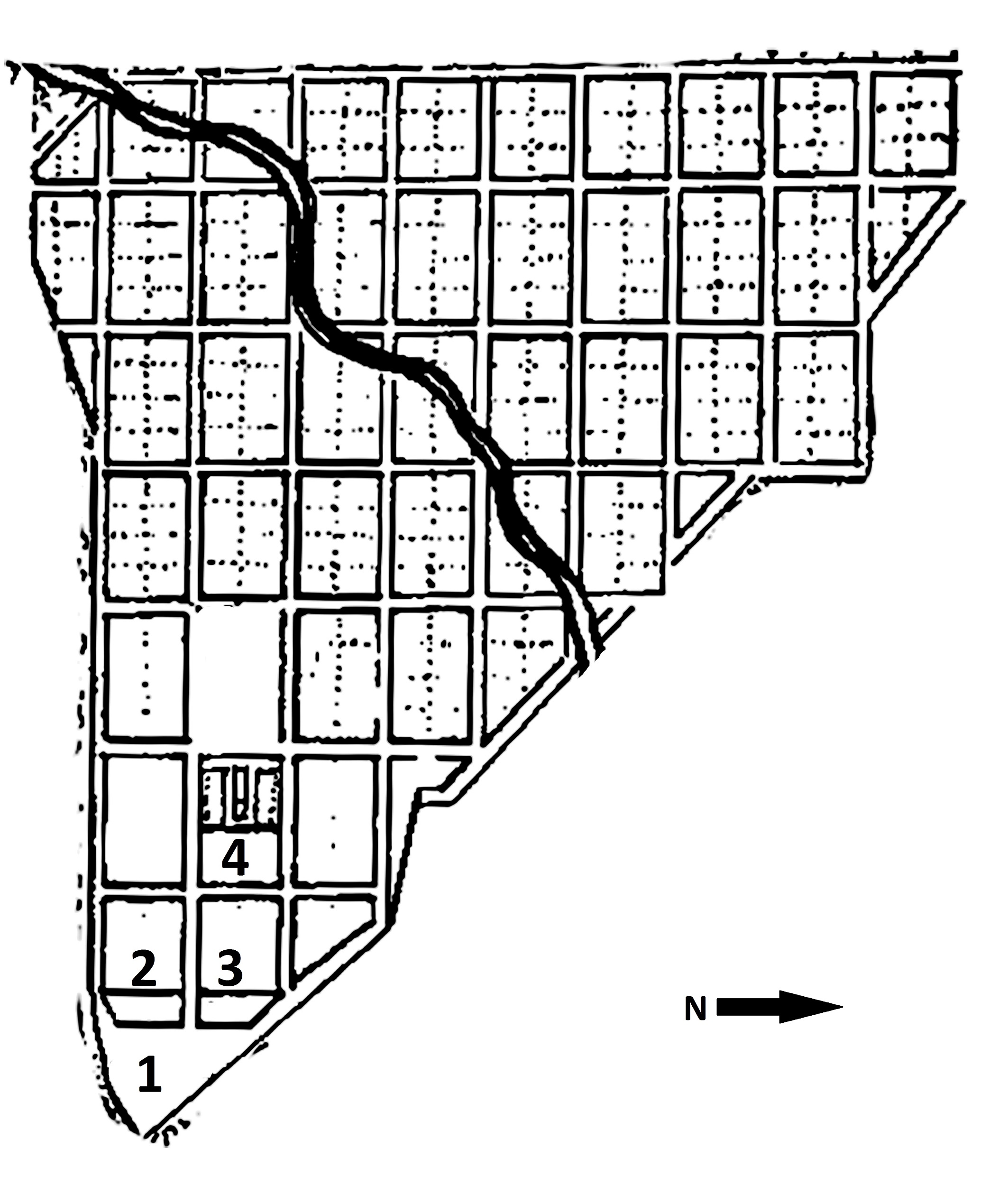 1: Plaza de Armas; 2: Corregidor; 3: Aduana; 4: Manzana de la iglesia.