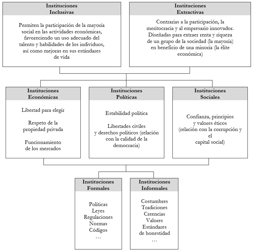 El papel central del marco institucional en la configuración de las ventajas competitivas obliga a profundizar en su alcance, en la naturaleza de las instituciones y en su relación con los procesos de crecimiento y desarrollo. Probablemente la definición más extendida en la literatura sea la ofrecida por North[3], para quien las instituciones son las reglas de juego de una sociedad, el conjunto de restricciones del comportamiento que modulan la interacción humana, y que, en consecuencia, estructuran los intercambios políticos, económicos y sociales[4].
