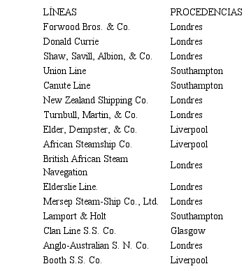 Desde luego había muchas más compañías británicas que operaban con los muelles de Santa Cruz y Las Palmas, como la escocesa Clan Line, Bullard, King and Co., la Rennie, Son and Co., etc., pero no ofrecían un servicio regular como las anteriores, lo que las hacía poco atractivas de cara a los exigentes viajeros. También habría que decir que entre los últimos años del siglo XIX y primeros de XX aumentarían las navieras británicas que operaban con los puertos de las islas, como la escocesa Aberdeen Line, la Geo. Thompson and Co. (los agentes de ambas era la Casa Hamilton), The Belgian Mail Steamers, «que aunque belga salía de Southampton y su agente en Santa Cruz era Elder, Dempster and Co., y, sobre todo, la Yeoward Bros».