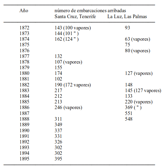 La arribada de vapores británicos a Santa Cruz de Tenerife y Las Palmas de Gran Canaria va en progresivo aumento. Excluyendo los barcos de guerra de la marina británica y los dedicados al comercio de cabotaje y veleros, el número de navíos de ese país que arribaron en los dos principales muelles de Canarias, Santa Cruz y de La Luz, llegaron a triplicar y cuadriplicar, como fue el caso del de La Luz en 1888.