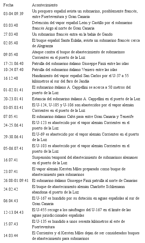 La Kriegsmarine contaba con el archipiélago para reabastecer a sus U-Boote, ampliando su radio de acción hasta las aguas del África occidental. Los preparativos comenzaron varios años antes de la Segunda Guerra Mundial y al menos desde enero de 1940 ya estaba disponible el Corrientes en el puerto de la Luz para esta misión. En este sentido, es preciso destacar que la mayoría de los submarinos alemanes que navegaron en aguas canarias no tenían como objetivo buscar barcos británicos en ellas sino tomar provisiones y combustible que les permitieran llegar hasta el África occidental o regresar a sus bases en la costa atlántica francesa. Así ocurrió con el U-37, que intentó infructuosamente abastecerse en el Corrientes en diciembre de 1940 y febrero de 1941, en este último caso junto con el U-43, igualmente sin suerte. Y sobre todo con los seis submarinos que entre marzo y julio de 1941 sí consiguieron ser abastecidos por dicho buque dentro del puerto de la Luz: U-124, U-105, U-106, U-123, U-69 y U-103. Otros actuaron a centenares de kilómetros del archipiélago, especialmente desde finales de 1942, y algunos llegaron a ser hundidos en Canarias, como el U-135, a unos sesenta kilómetros al este de Fuerteventura, o el U-167, en aguas jurisdiccionales españolas al sur de Gran Canaria. Con el fin de rescatar a la dotación de este último, otro submarino alemán, el U-455, llegó hasta el límite de las aguas jurisdiccionales españolas en dicha isla. No queda en cambio constancia de que Fuerteventura fuera una base de submarinos ni parece creíble, dadas las dificultades que la Etappenorganisation había encontrado en La Luz para organizar un servicio mucho más discreto, el cual, a pesar de todo, fue descubierto por los servicios de inteligencia británicos.