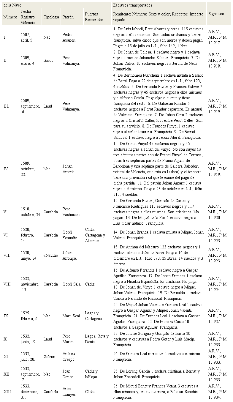 En el listado siguiente se resume toda la información que sobre esclavos procedentes de Lisboa aparece en la serie del P.M. -base, insistimos, de este estudio-; aunque en este epígrafe, de acuerdo con su título, sólo comentemos su número. Dicha relación consta de dos partes. En la primera se trata de localizar los buques, asignando a cada uno de los trece un número en caracteres romanos, para proporcionar a continuación la fecha de su registro en Valencia (en orden inverso a como aparece en la documentación), su tipología[47], su patrón y los puertos recorridos entre el de origen (Lisboa) y el de destino (Valencia). La omisión de este último extremo significa que el mercante en cuestión no realiza escala alguna. Una vez caracterizadas las embarcaciones, se pasa a una segunda parte dedicada a plasmar todos los datos referidos a los esclavos transportados, silenciando el resto del cargamento. Cada una de las veintiséis partidas, con numeración arábiga, proporciona el nombre del remitente o remitentes precedido de la preposición «de», el número[48], sexo, color y cuantos pormenores de los esclavos se expresen, así como el nombre del receptor o receptores (a veces los mismos remitentes) tras la preposición «a»; también lo pagado en concepto de peajes o el motivo de la exención. En el primer caso se remite a la fecha y número de folio de la serie L.J., en donde también se hace constar la cantidad, una vez entregada. La relación se cierra con la signatura correspondiente a la serie del P.M., de la que procede la información.
