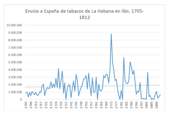 Si contabilizamos las salidas oficiales de tabaco de La Habana a partir de 1763, se dirigirán a la metrópoli el 77% del total y al territorio americano el 23% restante. Los principales compradores serán Cartagena (37%), Lima (29% que representó el 57% de todo el polvo exportado), Panamá (22%) y, finalmente, México (7%, la mayor parte en polvo)[138].