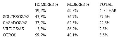 Figuran como casados el 29,3% del total de habitantes, y de ellos el 62,8 de las mujeres; por último, en estado de viudez se halla el 9,5% de la población, y eran viudas el 86,2%. Es evidente que el número de mujeres que sobreviven a sus maridos es abrumadoramente elevado. Más significativo, si cabe, es el porcentaje de las mujeres casadas frente al de los varones: el desequilibrio que muestran las cifras solo puede obedecer a la ausencia de los esposos en estos hogares.