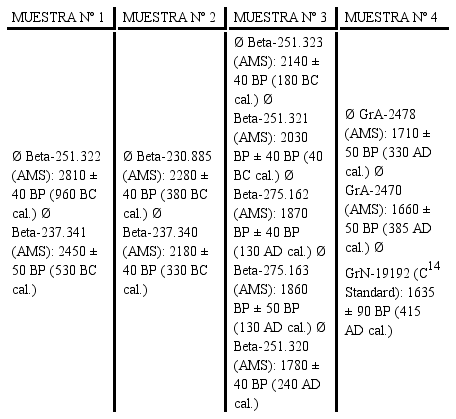 Las tres muestras que fueron seleccionadas para analizar poseen una amplitud cronológica que discurre entre los siglos X ANE y III DNE (Cuadro 1). En concreto el estrato II (muestras nº 1 y nº 2) está datado con cuatro fechas que lo sitúan entre los siglos X ANE y IV ANE, mientras que el estrato I (muestra nº 3) está datado con cinco fechas que lo sitúan entre los siglos II ANE y III DNE. La muestra de suido procedente de El Bebedero (muestra nº 4) consistía en un fragmento de maxilar y dos molares recuperados en el estrato IV-1 (corte A7, campaña de 1990), el cual está datado entre el final del siglo IV DNE y el inicio del siglo V DNE. Por tanto, esta última muestra corresponde a un cerdo que, desde la perspectiva cronológica, posee una datación posterior a los individuos muestreados en el sitio de Buenavista, lo que resulta muy adecuado para nuestro estudio ya que nos permite ampliar el arco temporal en el que podemos rastrear la genealogía de ese animal y, en consecuencia, los posibles cambios genéticos, anatómicos y/o raciales.
