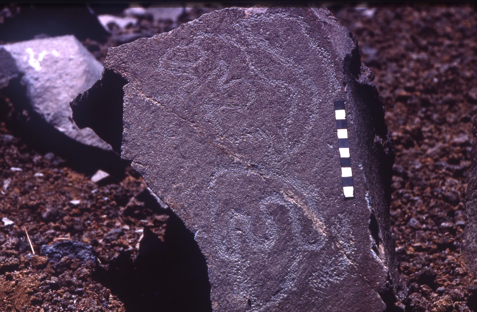 Este grabado rupestre es muy interesante por su ubicación en el centro de un ancho y suave lomo que finaliza en el Roque de los Cuervos. El soporte es una gran roca suelta, aunque está en su posición originaria, que actúa como un nítido punto de referencia para todos aquellos que siguen esta ruta hacia los bordes de La Caldera. El panel está expuesto hacia el sur y el motivo es un meandriforme de gran desarrollo que está encerrado en una figura triangular.
