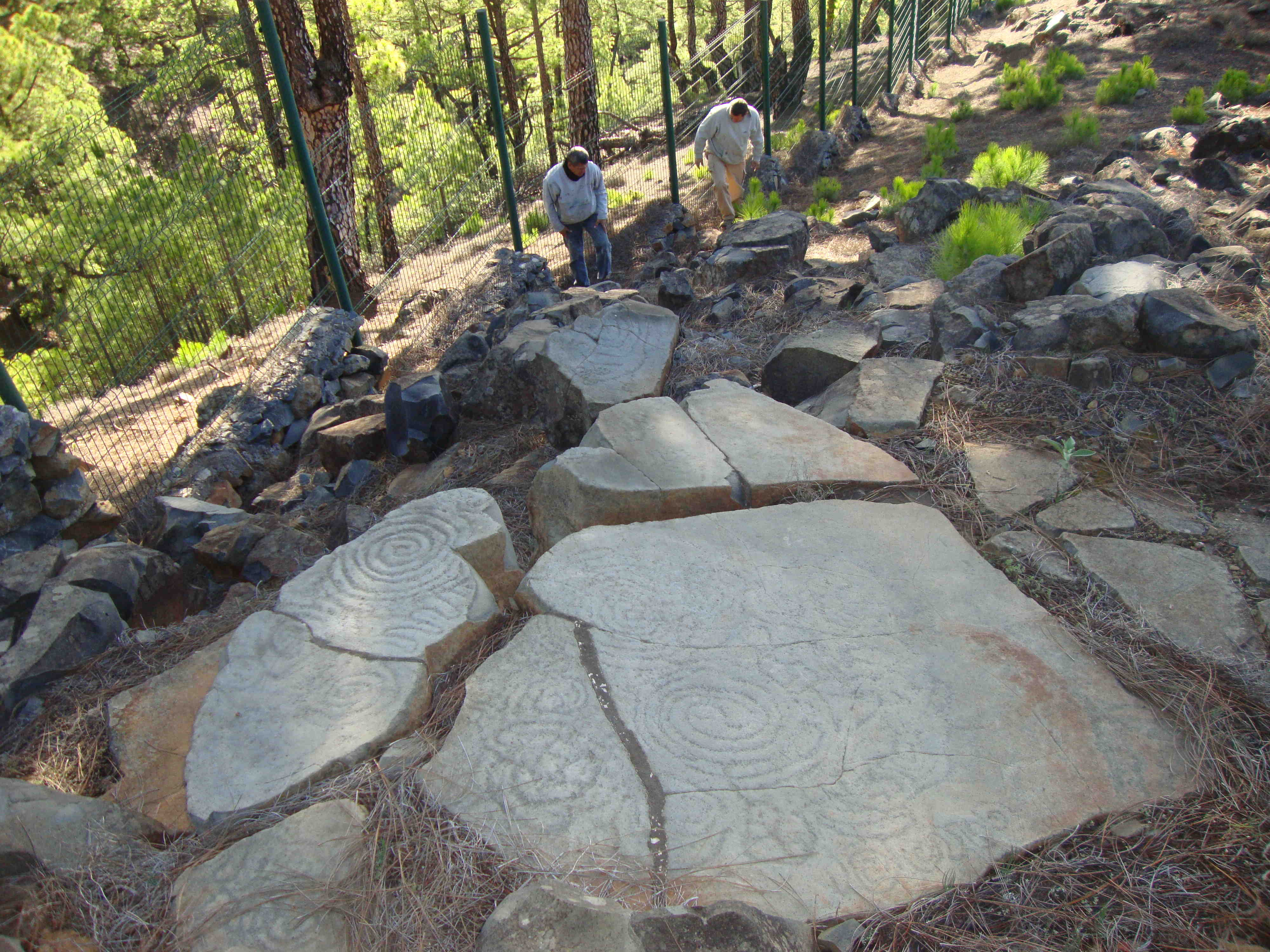 Los petroglifos del calvario fueron citados por primera vez en 1922 por A. Jiménez de Cisneros[15]. Uno de los datos más interesantes es que, al parecer, los diferentes paneles constituían una especie de pirámide que ha sido desmantelada en tiempos recientes[16]. Sin embargo, desde nuestro punto de vista, y a pesar de que algunos paneles están alineados e hincados en el suelo, dada la estructura del terreno, nos parece poco probable que existiese una estructura de características similares a los amontonamientos de piedra que aparecen en los bordes de la caldera de Taburiente, puesto que no queda ningún rastro del relleno típico de este tipo de estructuras artificiales.