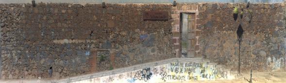 De toda esta construcción, los únicos restos que, a nuestro juicio parecen antiguos, son los que se hallan más cercanos a la trasera de la iglesia de Santo Domingo. Para definir con detalle estas cuestiones, nos parece necesario realizar un estudio detenido sobre todos los paramentos, aplicando los criterios de la “Arqueología de la arquitectura”, que lo consideramos un buen ejemplo para ensayar este método de análisis. En apariencia, los únicos paños del muro que pueden ser antiguos, además de la parte que hemos señalado, podrían corresponder, también, a algunas otras que forman su basamento. Y es posible, además, que un buen número de las piedras con las que se construyó el muro podrían corresponder a las que sirvieron primitivamente para su fábrica. Estos aspectos técnicos son, sin duda, los más difíciles de definir por las diferentes reconstrucciones a las que estaría sometido el muro, pero no deja de tener interés para entender cómo se construyeron los distintos paramentos que lo conformaron. Sin embargo, contamos con dos datos que los consideramos de interés para verificar la antigüedad del citado recinto. En el plano de la ciudad de San Cristóbal de La Laguna, elaborado por Leonardo Torriani, ya figura el contorno del muro que arranca desde la trasera de la citada iglesia de Santo Domingo y que actualmente rodea el rectorado[35], lo que nos parece, sin duda, un dato relevante por la coincidencia de lo que aparece en él con la estructura actual del muro. El otro aspecto de interés para fijar su cronología es el tipo de enfoscado del muro que es semejante al del paramento que aún permanece en la ermita de San Miguel.