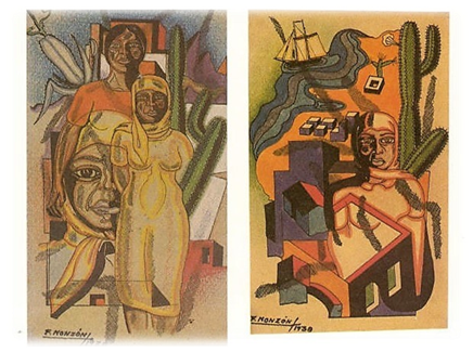 Esta apelación esencialista a una «canariedad» basada en el compendio «de las formas y tipos isleños»[25] hace que sus retratos de Campesinos, Hombres y Mujeres del sur (1932, 1933) y también sus Composiciones canarias (1937,1938) recuerden al estadio del espejo lacaniano[26], una fase conforme a la cual la sociedad canaria que describe Monzón aparece como un colectivo con escasos niveles de auto-reconocimiento, a causa de la incidencia histórica de la colonialidad. Así, la pátina ideológica que posee su pintura es útil para combatir las consecuencias del racismo mediante la proyección, sobre su población contemporánea, de una revisión fantasmática de sus orígenes.