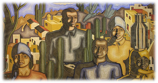 En este detalle del cuadro Composición canaria (1937), realizado por Monzón en el campo de concentración de Gando, se aprecia cómo la «naturaleza ideológica y partidista» que proclama su obra no persigue «tanto la necesidad de describir la realidad sin adornos, como el hecho de cambiarla […]. El artista trata de ofrecer una síntesis de la realidad insular cifrada en la imagen del pueblo como sujeto de la historia. Toma partido por una clase social, el campesinado, frente a la burguesía urbana». De modo que «puede decirse que la suya fue la primera manifestación de la lucha de clases en el arte canario»[65].