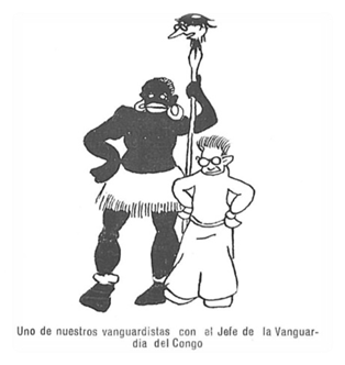 Ilustración de Miguel Borges que acompaña al artículo satírico Al margen de un manifiesto (14/2/1928), publicado por Hespérides como reacción al Primer Manifiesto de la Rosa de los Vientos, al que se culpa de la «algarabía periodística» sin «paralelos en la literatura insular» causada por su «sentido de ruptura» y «gozoso deseo subvertidor»[118]. El dibujo pretende ridiculizar el universalismo predicado por las vanguardias a través de la racialización extrema de la cultura africana de las que estas se apropian.