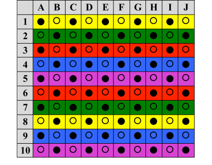 Foi projetada na TV LCD, uma matriz de dez linhas e dez colunas. As linhas e colunas foram sinalizadas, respectivamente, com números de 1 a 10, e letras de A à H. As linhas da matriz eram de cores alternadas, de forma que havia duas linhas de cada uma de cinco cores (amarelo, verde, vermelho, azul e roxo), sendo uma linha par e uma linha ímpar de cada cor. Na interseção de cada linha com cada coluna poderia haver um círculo preenchido ou um círculo sem preenchimento. A Figura 1, a seguir, ilustra a matriz empregada no presente estudo.