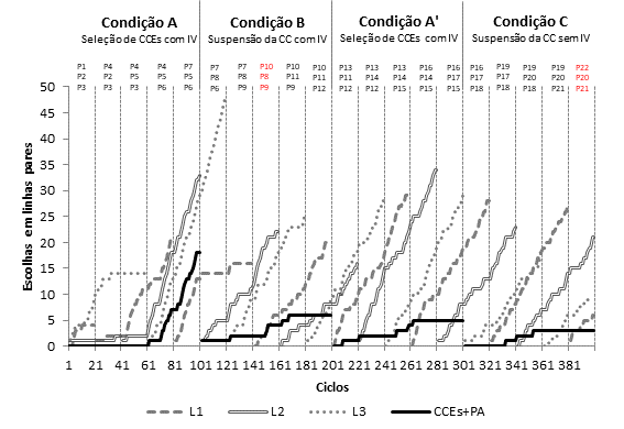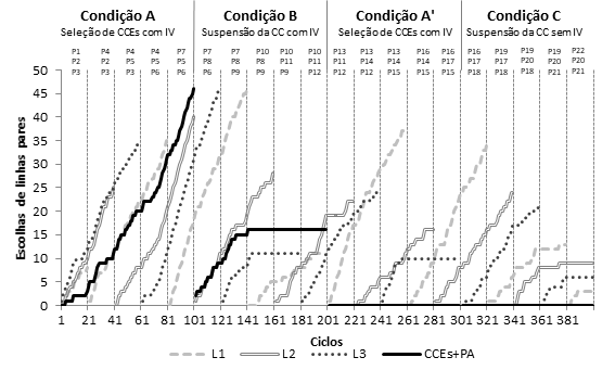 Após a saída de L2P5 e com a mudança para a condição B (Suspensão de CC com IV), as escolhas variaram muito e a frequência de escolhas de linhas pares de cores diferentes diminuiu bastante. Durante a condição B, dos ciclos 100 a 130, os participantes discutiram as escolhas e tentaram descrever a metacontingência em vigor. A partir do ciclo 141, as verbalizações se restringiram a ocasiões de mudança de geração, permanecendo neste padrão até o fim do experimento. Este dado pode explicar a baixa frequência de ocorrência de entrelaçamentos-alvo na condição A’. Na condição C (Suspenção da CC sem IV), escolhas em linhas pares de cores diferentes pouco ocorreram.