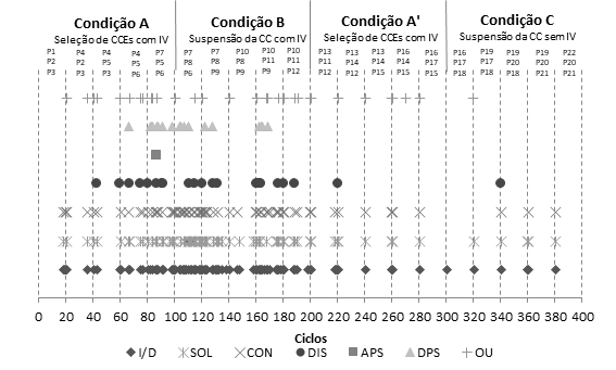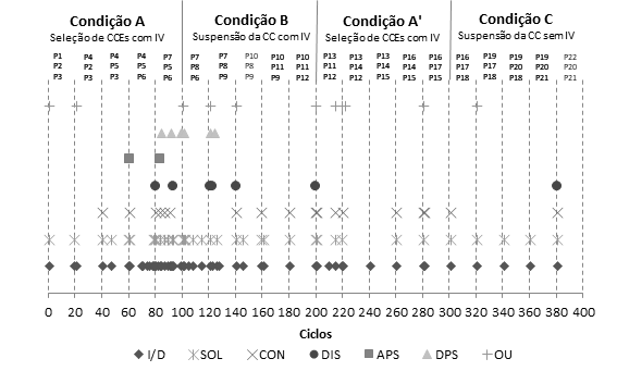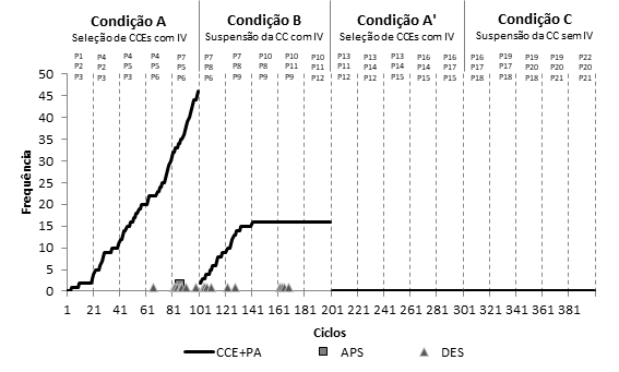 A probabilidade de ocorrência ao acaso das CCEs+PAs nas condições A e A’ era de 6%. Durante a condição A, a taxa de recorrências das CCEs+PAs alcançou 65% em um curto período de 20 ciclos ao final da condição (do ciclo 81 ao ciclo 101), indicando um processo de seleção em curso. Já na condição A’, claramente não houve seleção das CCEs+PAs, encontrando-se, nessa condição, uma taxa de recorrência do entrelaçamento alvo abaixo da probabilidade ao acaso e semelhante ao observado nas condições B e C.