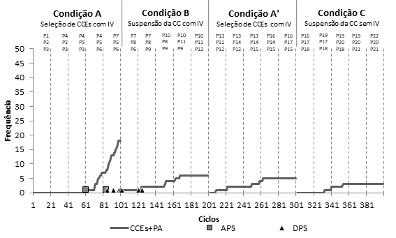 A Figura 7 apresenta dados relativos à ocorrência de verbalizações do tipo “aprovação social” e “desaprovação social”, bem como a frequência acumulada de CCEs+PAs. Apenas uma verbalização do tipo “aprovação social” foi registrada. Já as verbalizações do tipo “desaprovação social” ocorreram entre os ciclos 60 e 180, coincidindo (exceto no intervalo dos ciclos 160-180) com o período em que as CCEs+PAs foram mais frequentes.